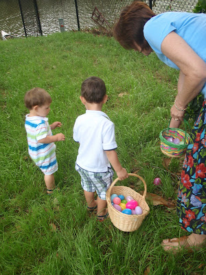 Before my mom and Don went to a baptism on Saturday, they filled and hid Easter eggs for Dylan and Isaac. Dylan had his pink right eye, so we didn't do anything with other little kids that morning. I had my mom promise she wouldn't mow the part of her back yard where she had planted Rye grass b/c I knew it would be perfect for hiding eggs - and it was. We couldn't even see some of the eggs until we were directly over them. I was planning on using her grass and doing my own eggs, but my mom and Don did it all. She even filled some with squishy dinosaurs which were a big hit.